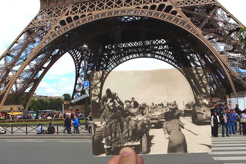 | Fotografía de la ocupación alemana de París en 1940, sobre una foto actual. (© Julien Knez) |